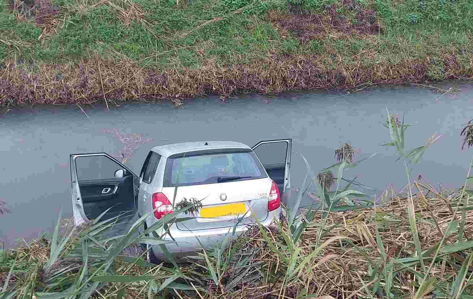 Car takes a dip after collision on grass verge in Rye
